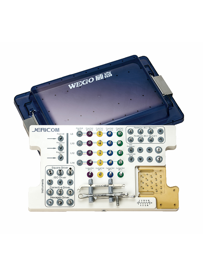 本套器械為JERICOM牙種植體系統(tǒng)專用外科種植手術(shù)器械,采用顏色標(biāo)記的設(shè)計(jì),讓手術(shù)流程一目了然;整套器械由瑞士專業(yè)牙科工具供應(yīng)商制造,加工精良,設(shè)計(jì)合理,精確耐用;滅菌盒可反復(fù)高溫壓力滅菌,便于清洗,內(nèi)置配件盒,方便器械滅菌與使用。